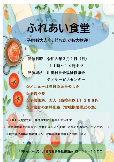 川場村社会福祉協議会では、子どもから大人まで、地域の皆様がどなたでも気軽にお立ち寄りいただける「ふれあい食堂」を開催いたします。