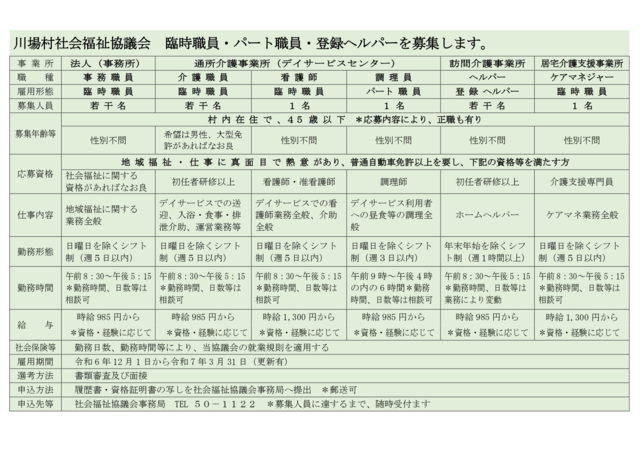 介護職員、ヘルパー、看護師、調理員、送迎運転手など各種臨時職員を募集しています。隙間時間などの短時間でも大丈夫ですので、介護保険事業や地域福祉事業に興味のある方がいらっしゃいましたら、ご連絡をお待ちしています。